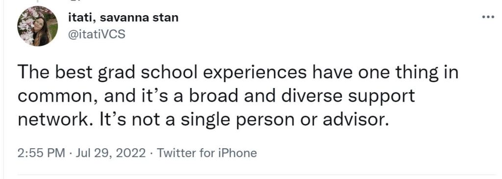 This post was inspired by this tweet by Itati, which points out that your graduate experience is so much more than your relationship with your advisor. I find myself getting a little frustrated by the grad school advice that hyper-fixates on the idea you have to find your perfect advisor and 1. you’ll easily be able to do that 2. a good advisor solves everything. While its true that a healthy advising situation is important, my personal belief is that a strong support network is just as vital to your success in grad school. I believe a strong support network is these parts: